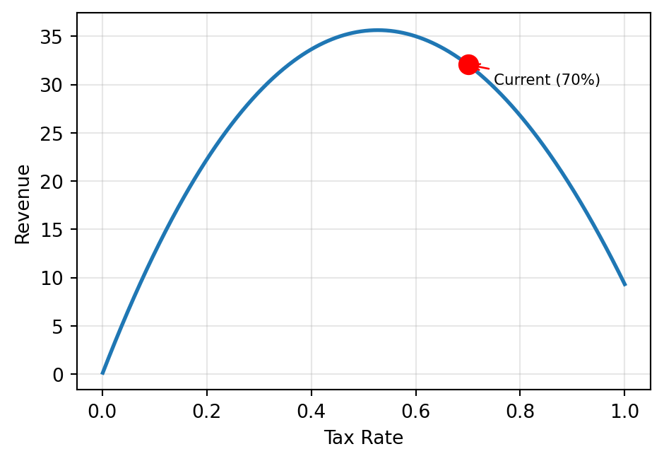 \(f'(0.7) < 0\) → revenue is decreasing at 70%. We should lower the tax rate!