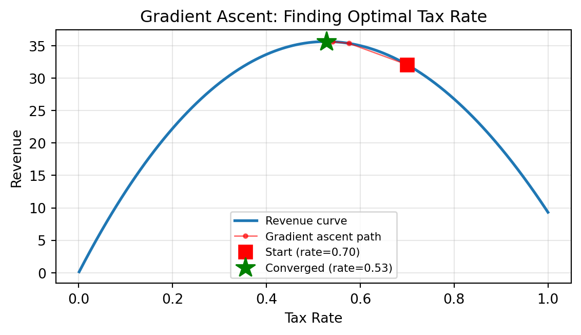 Starting from 70%, gradient ascent converges to the optimal tax rate in a few dozen steps.