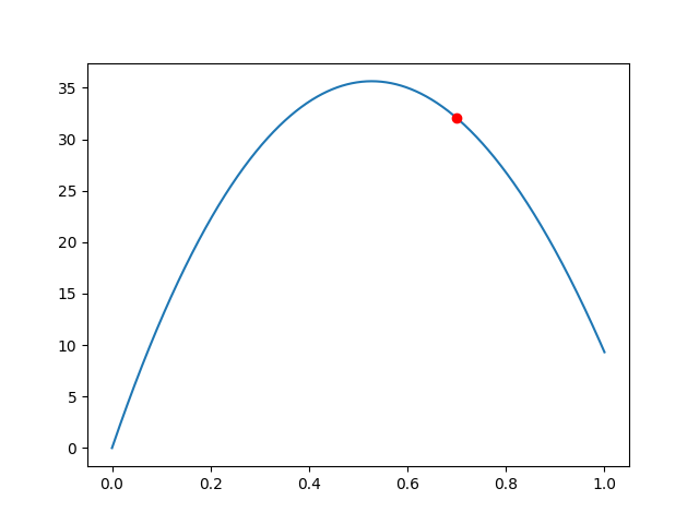 Our revenue function: \(f(x) = 100\left[\ln(x+1) - (x-0.2)^2 + 0.04\right]\)