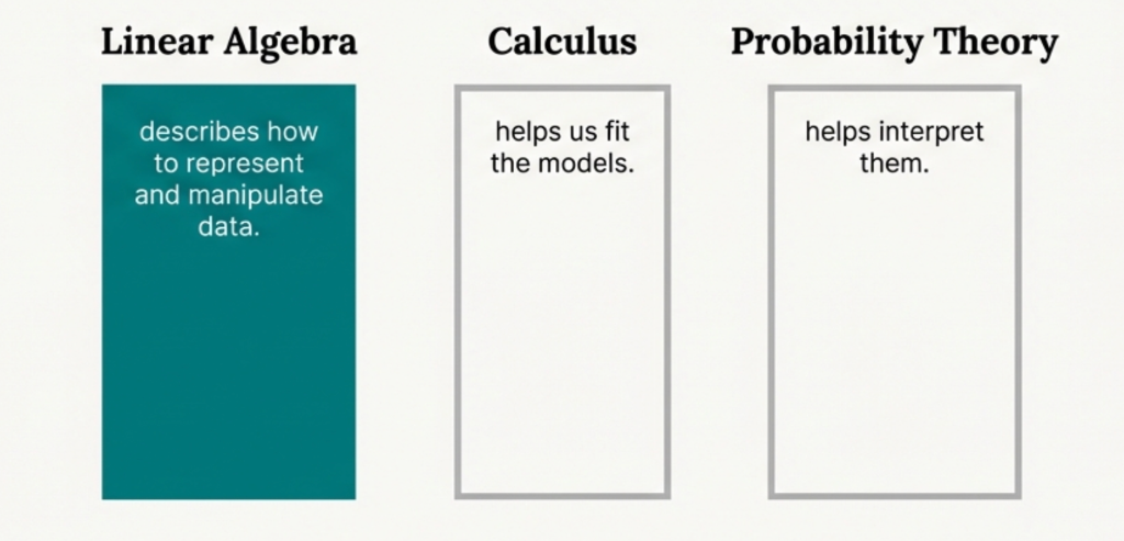 The Language of Data The mathematics of machine learning rests upon three pillars: linear algebra, calculus, and probability theory.