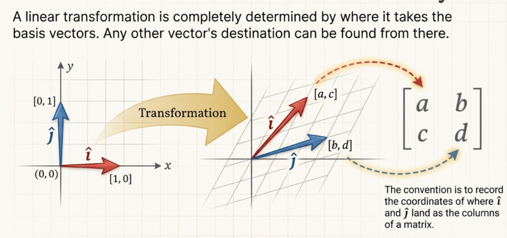 Matrix columns show where basis vectors \(\hat{i}\) and \(\hat{j}\) land after the transformation!