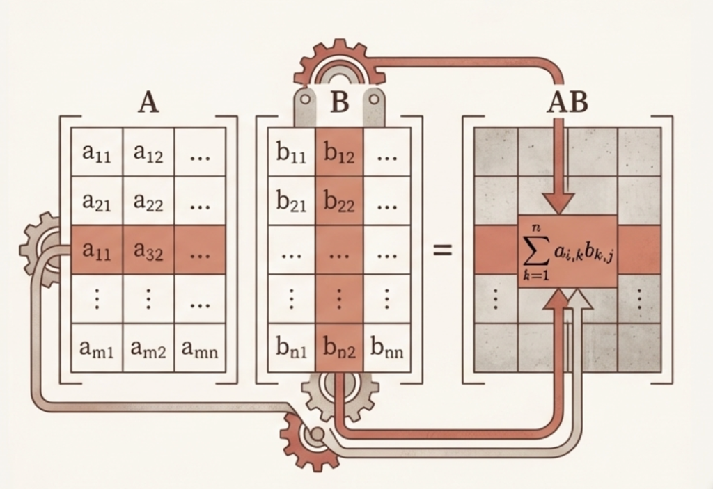 \[c_{ij} = \sum_{k=1}^{n} a_{ik} \cdot b_{kj}\]