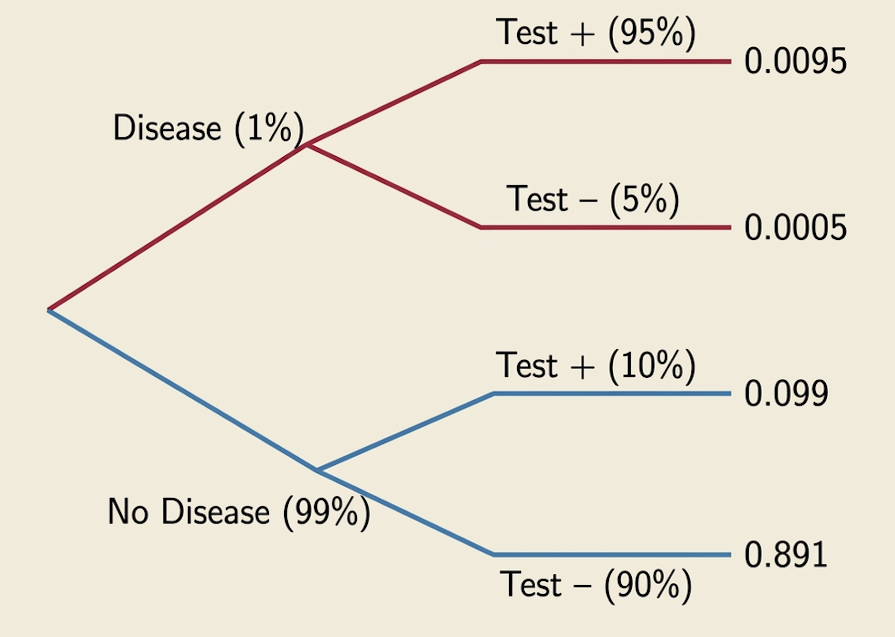Result: \(P(D \mid T^+) \approx\) 8.8%. Even with a “highly accurate” test, a positive result means only an 8.8% chance of disease!