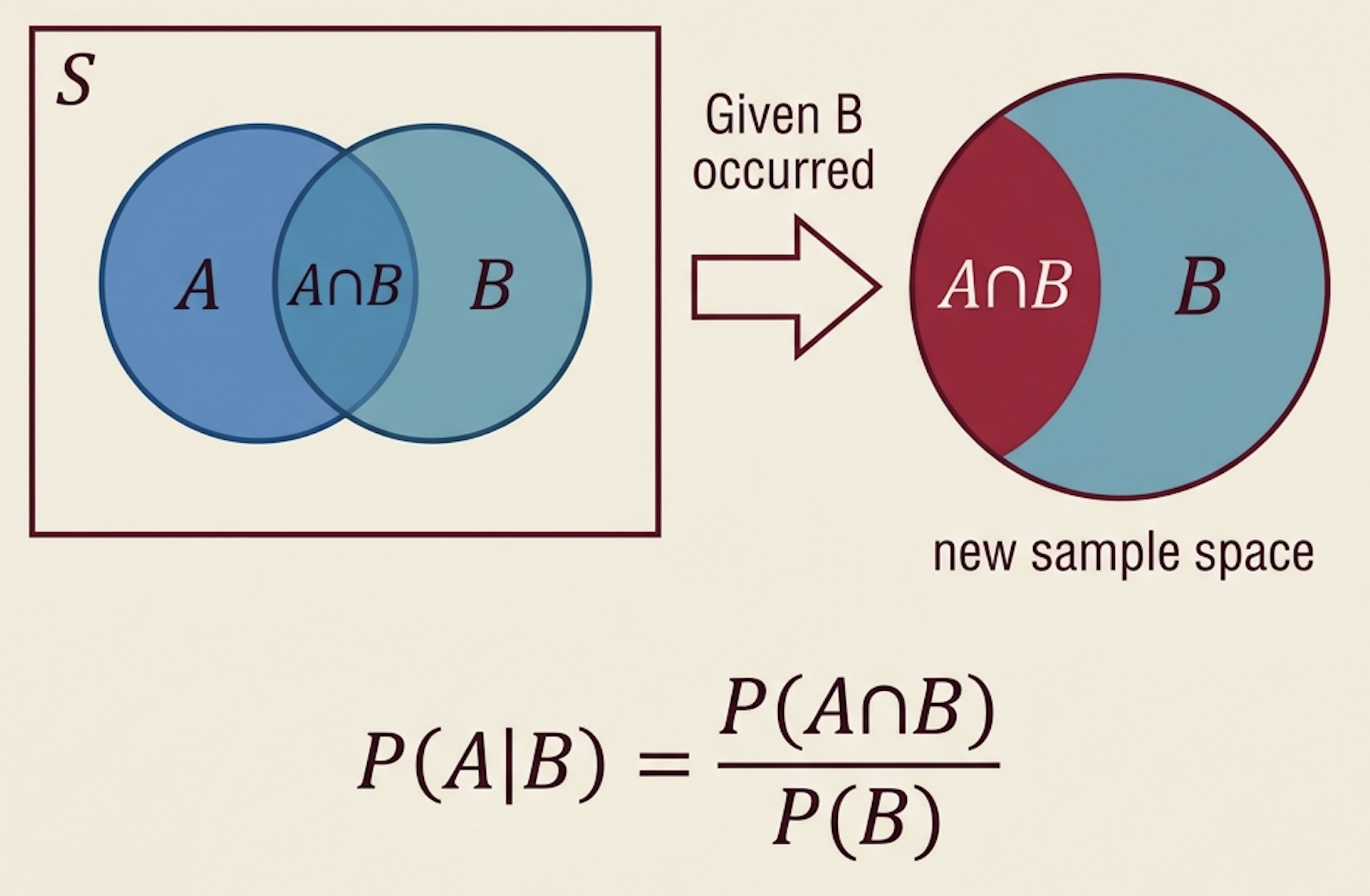 Intuition: Once we know \(B\) happened, the sample space shrinks to just \(B\). Among those outcomes, how many also satisfy \(A\)?