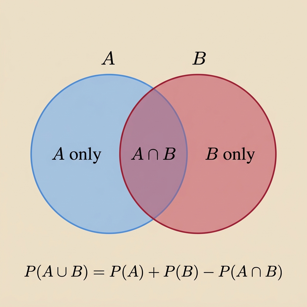 | Independence | \(P(A \cap B) = P(A)P(B)\); knowing one event gives no info about the other |